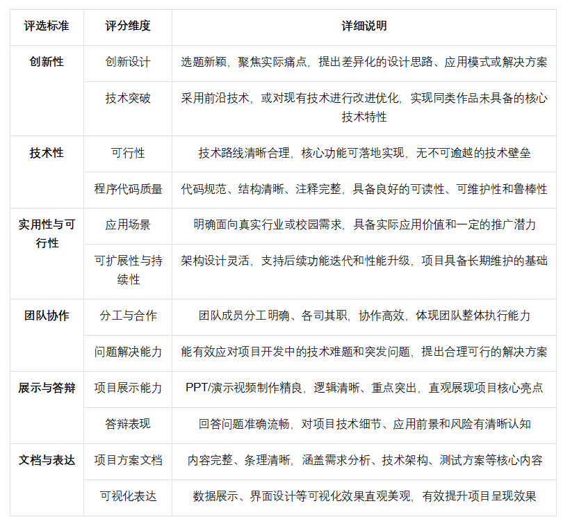 评审形式:参赛队伍需在规定时间内通过竞赛平台提交初步设计方案,内容包括项目技术方案、设计文档、可行性分析及初步代码实现。评审专家将从创新性、技术性、实用性等维度开展线下评审。